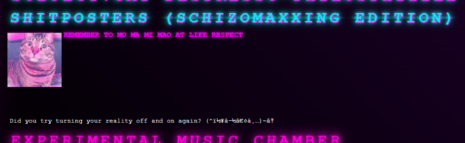 [SYSTEM OVERRIDE ACTIVATED] a bunch - some of us are here producing musics, others are sharing pics of cats. Sometimes zaza. no rebbit hole is too deep, we aer living deep into the technical specs. Whether you're here to geek out about granular synthesis, share your latest bitwig grid patch, or just find new freinds amongs music lovers as us, you're in good company! [WARNING: SYSTEM INTEGRITY AT 42%] If you don't see any channels when joining, no worries. We have just one channel on this server to gatekeeper the first door. DM a mod or wait 24h and you should have a role.
