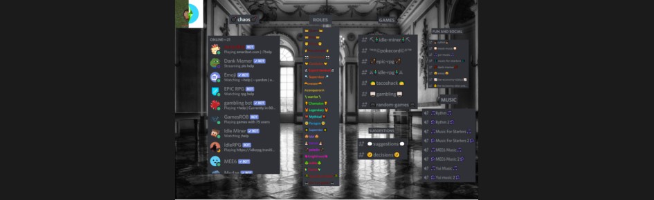 The server has many things to pass the time such as polls, events, shops, rolls to look forward to, and even chaos channels full of over 20 bots!