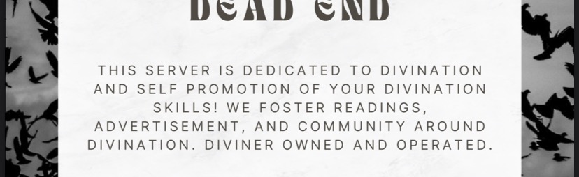 🃏 *Dead End* is a server dedicated to divination! Be it Tarot, Runes, Oracle, Scrying or otherwise! We're looking to foster an active community where you can advertise your services and provide and take readings!
