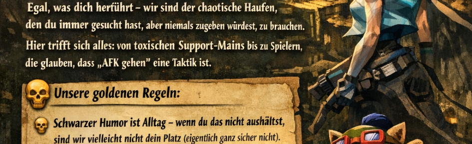 Willkommen auf Blighttown! Du magst es, in League of Legends von deinem Team geflamed zu werden, während du selber feedest? Oder dich in Lethal Company vor Geistern zu verstecken, obwohl dein Kumpel schon längst wie ein geplatzter Ballon aussieht? Vielleicht liebst du auch das Gefühl, in Valorant mit deinem 10%-Aim die Welt zu retten (Spoiler: Du tust es nicht). Egal, was dich herführt – wir sind der chaotische Haufen, den du immer gesucht hast, aber niemals zugeben würdest, zu brauchen. Hier trifft sich alles: von toxischen Support-Mains bis zu Spielern, die glauben, dass „AFK gehen“ eine Taktik ist. Unsere goldenen Regeln: 1. Schwarzer Humor ist Alltag – wenn du das nicht aushältst, sind wir vielleicht nicht dein Platz (eigentlich ganz sicher nicht). 2. Schlechtes Gameplay wird akzeptiert, aber nicht unkommentiert. 3. Spaß haben ist Pflicht, gewinnen nur optional. Also komm rein, setz dich hin, und lass dich von uns belehren, warum du in deinem Spiel Mist gebaut hast – alles in beste