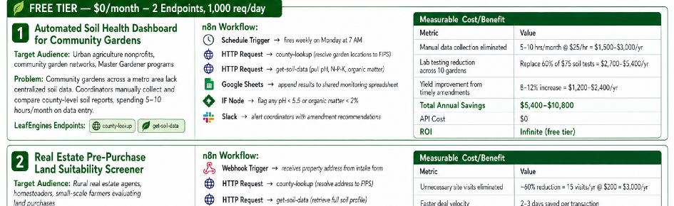 MCP Support (Connect to Claude!) *We published LeafEngines to the ClawHub skills *Examine the two uses cases using community access endpoints of (1) county_lookup and (2) get_soil_data and county_lookup