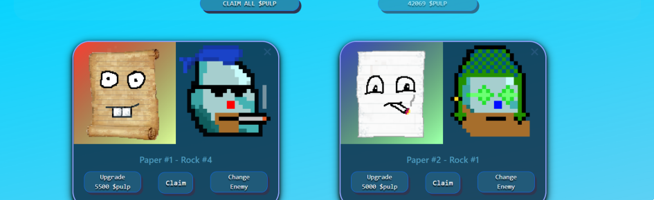 You can Mint Paper NFTs which fight Scissor Enemies alongside Rock NFTs (from the avax Rock Game) earning rewards in $PULP. Sell $PULP or use it to upgrade Paper NFTs so you can earn more and fight stronger Scissor Enemies earning you even more $PULP ! ??