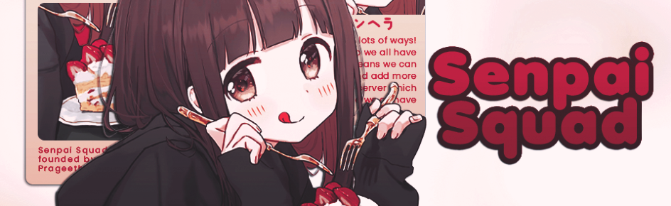 Hey, welcome to Senpai Squad! This server is all about having a good time with friends by spending time playing games such as Valorant, Genshin etc. as well as watching Anime and Korean Dramas together! Senpai Squad is a welcoming community to all, and we'd love to have you. Enjoy your stay!